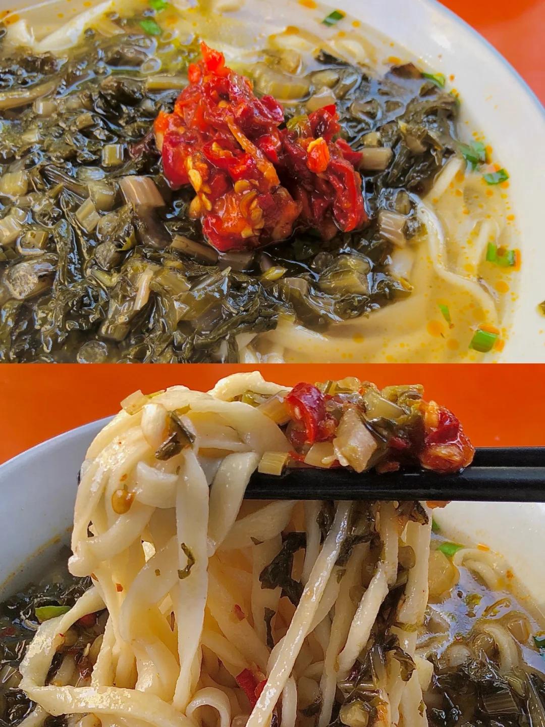 捞上一碗面条,淋上浆水汤汁,堆上爆炒的浆水臊子,撒一把油泼辣子。