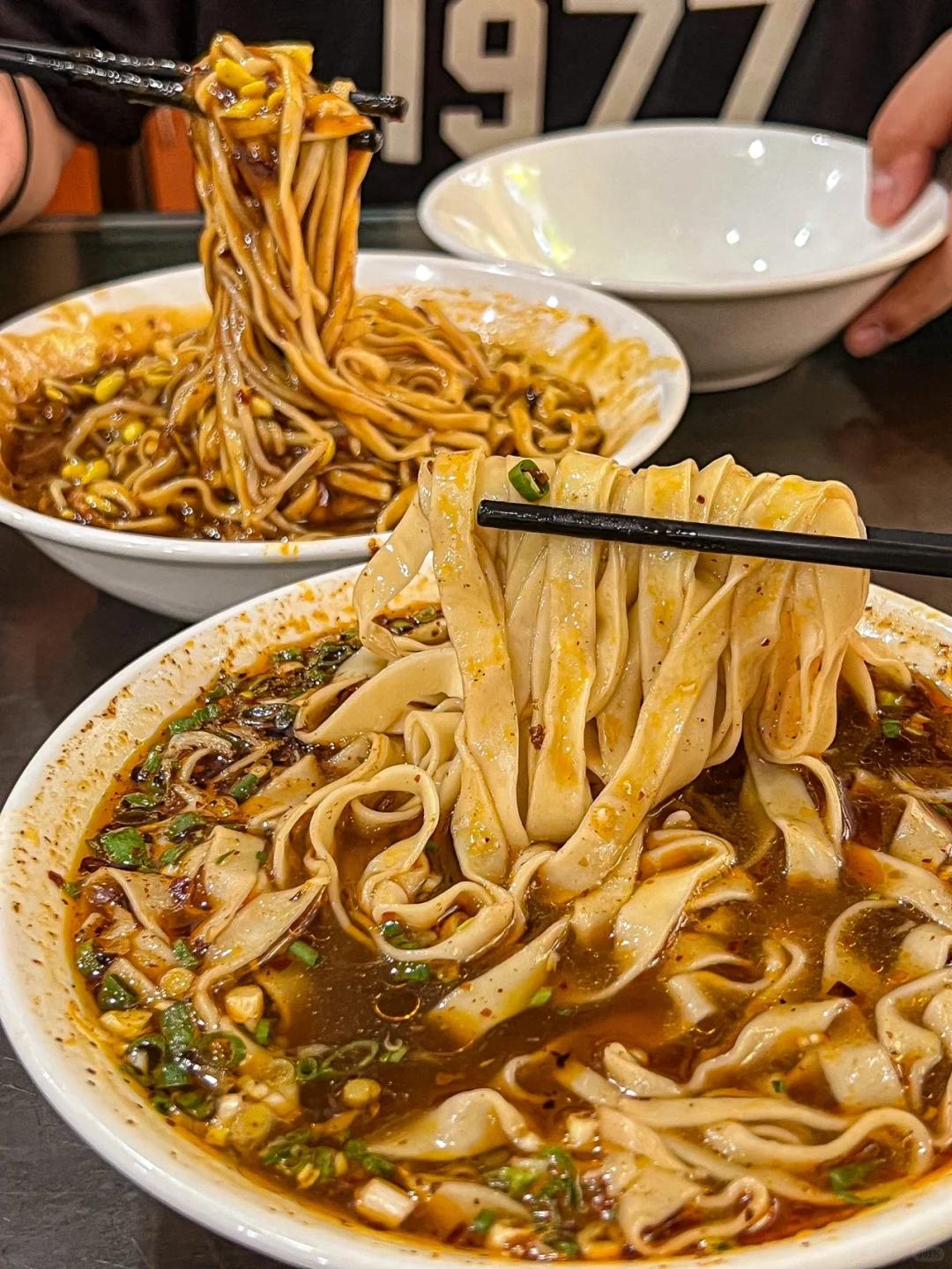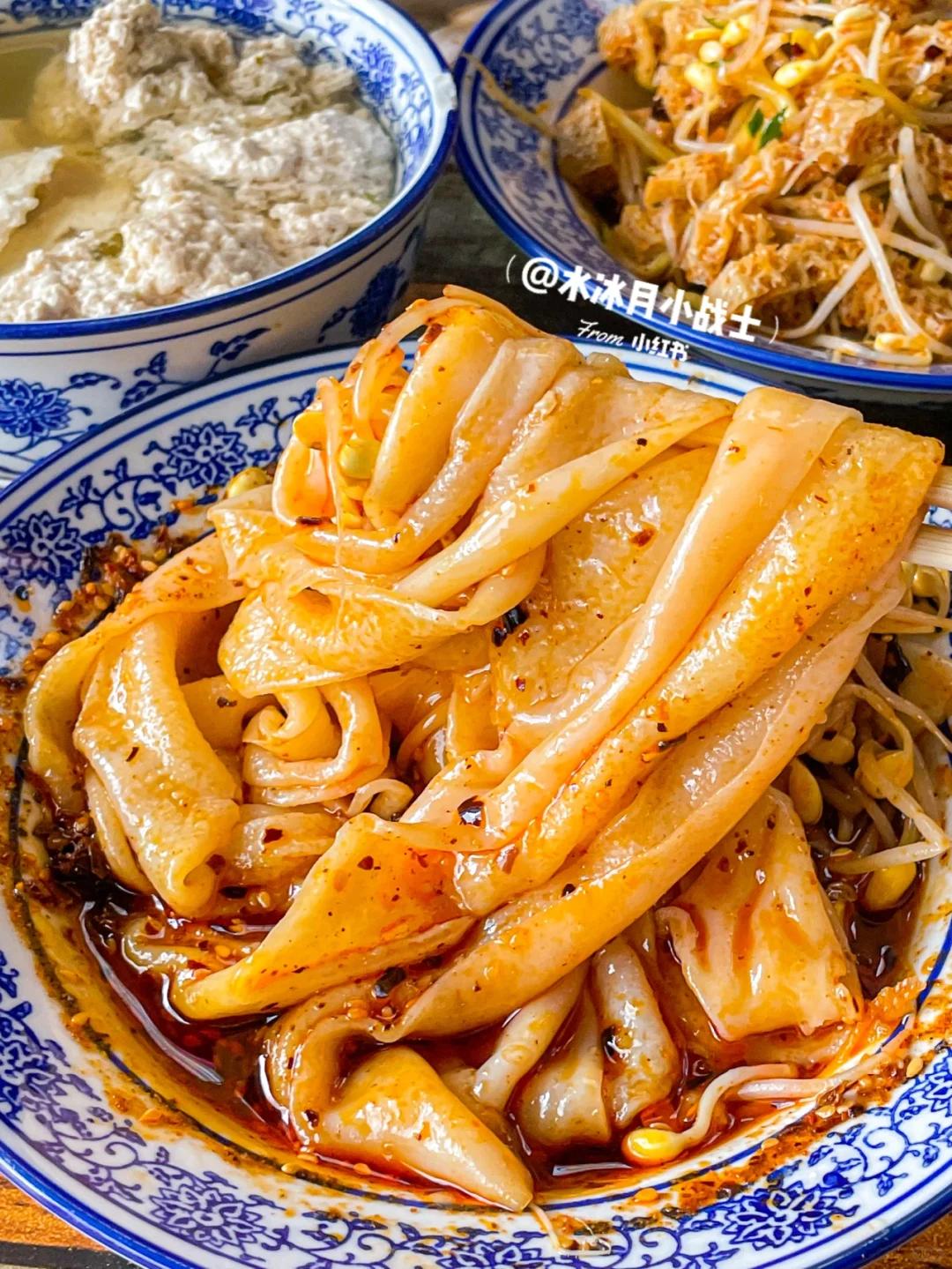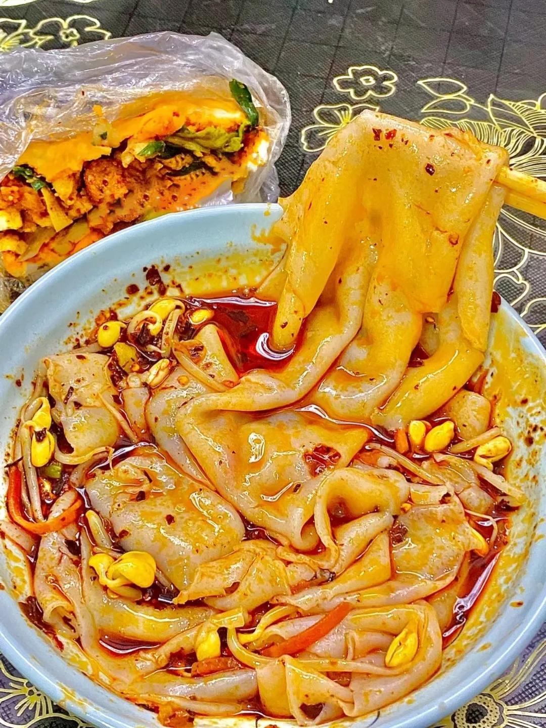 晨起嗦一碗热面皮,中午去吃浆水面,夜市的街头则少不了一碗梆梆面,还有槟豆凉粉,锅边油花……扎实的碳水,快活到飞起。
