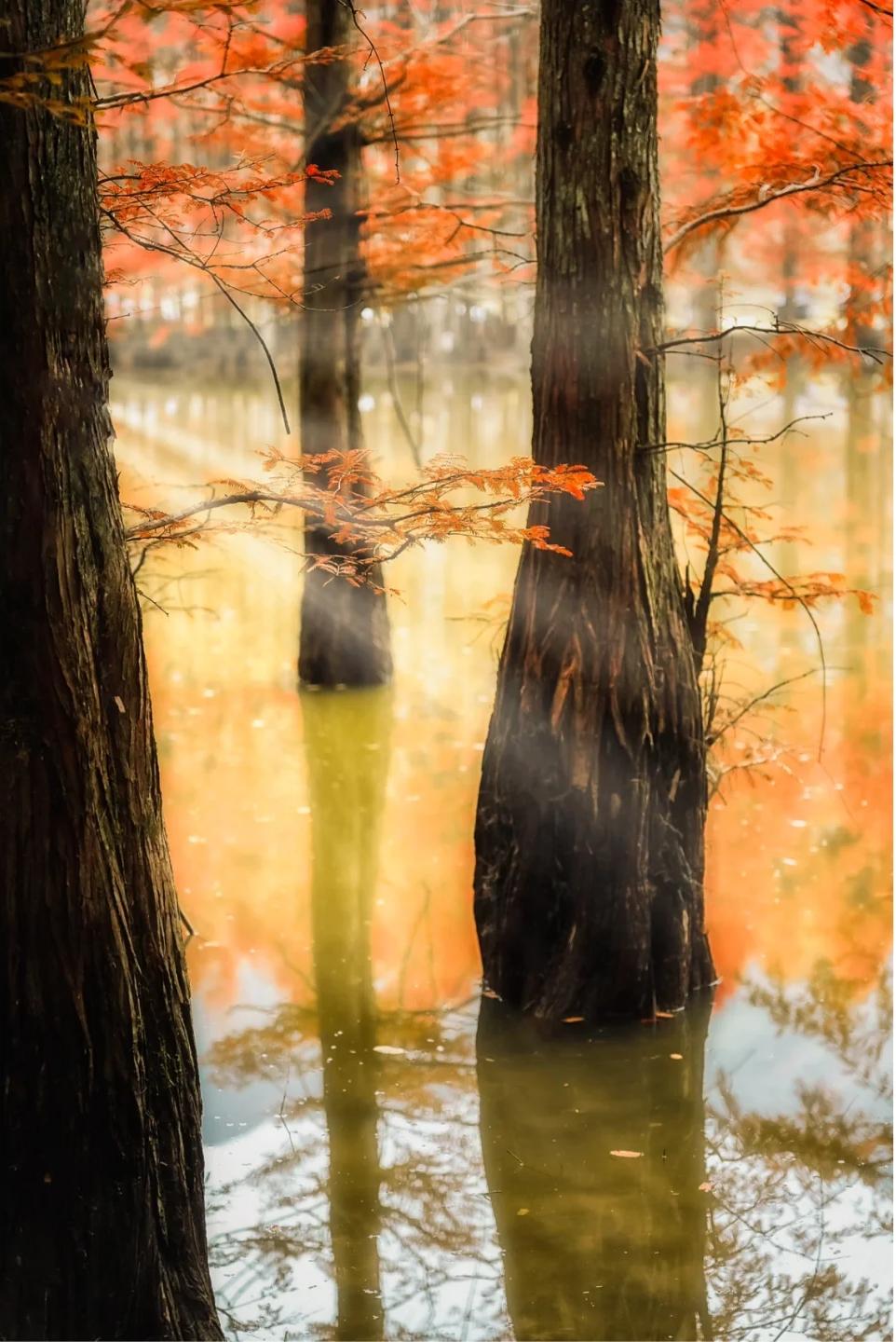 在此支帐露营拍摄星空,秋天是金黄的仙境,走在水杉林当中就仿佛置身新疆喀纳斯。