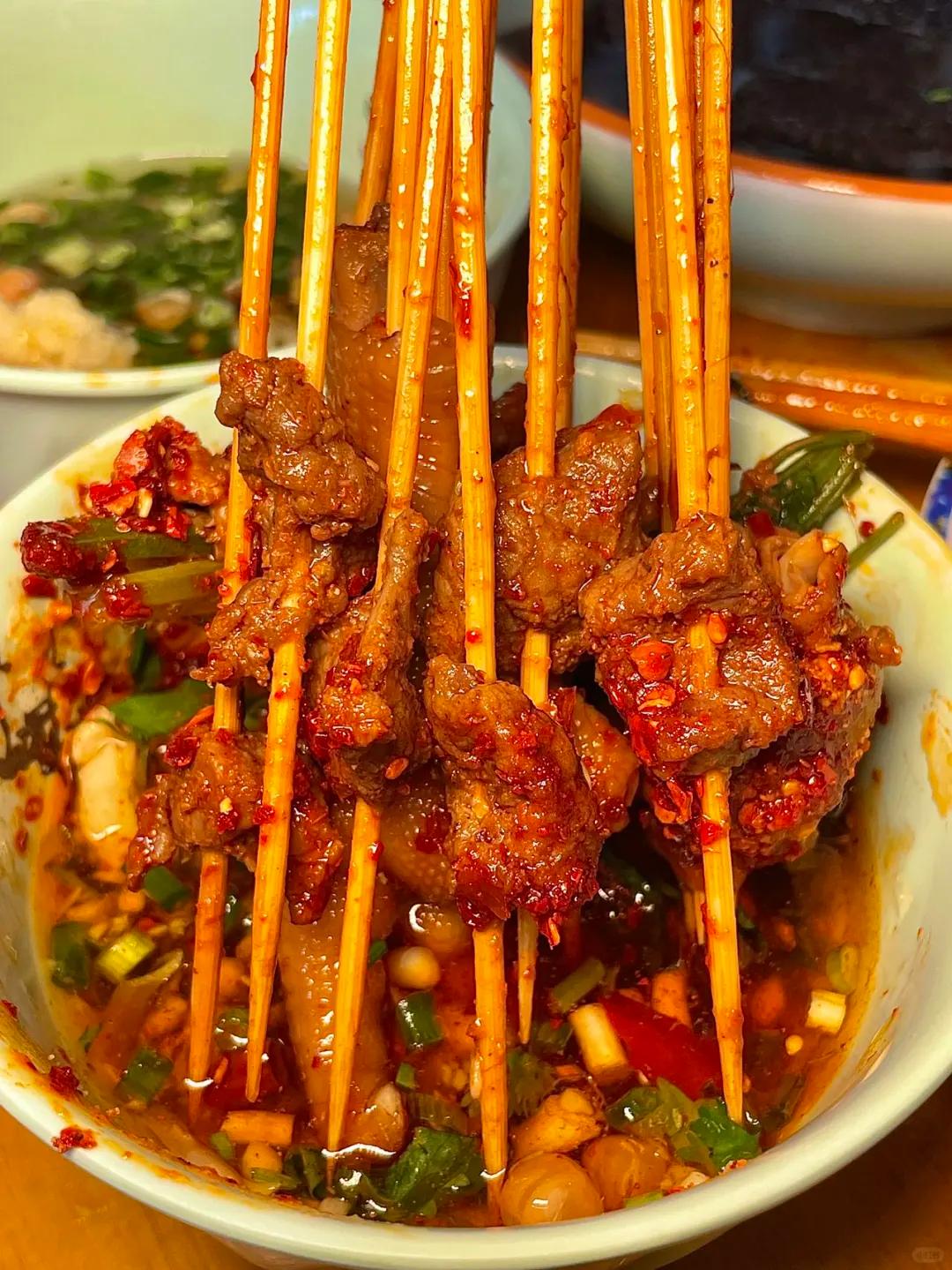 签子的种类也很丰富,各色的香菜牛肉,泡椒牛肉,毛都,鸭肠,酥肉,脑花,还有汉中特有的锅盔……再配上每个店家的秘制蘸料,就一个爽字!