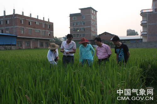 市气象局和市农粮局技术人员在田间开展晚稻病虫害调查。钟昭运 摄
