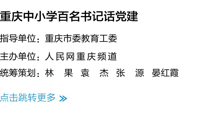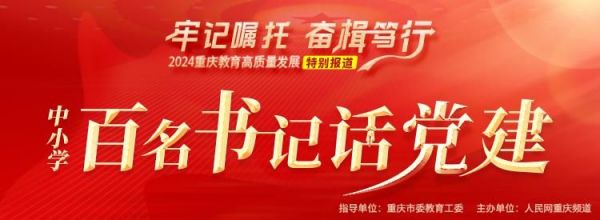 教育是国之大计、党之大计。坚持和加强党对教育工作的全面领导是办好教育的根本保证,是进一步办好人民满意的教育的关键所在。为全面贯彻新时代党的组织路线和党的教育方针,落实立德树人根本任务,重庆市委教育工委联合人民网重庆频道特别推出《重庆中小学百名书记话党建》专题报道,聚力抓学习、强堡垒、创品牌、育新人,促进中小学党建工作和教育教学双融合双促进双提高,努力为教育强市建设提供坚强保障,为新时代市域党建新高地建设贡献教育力量。