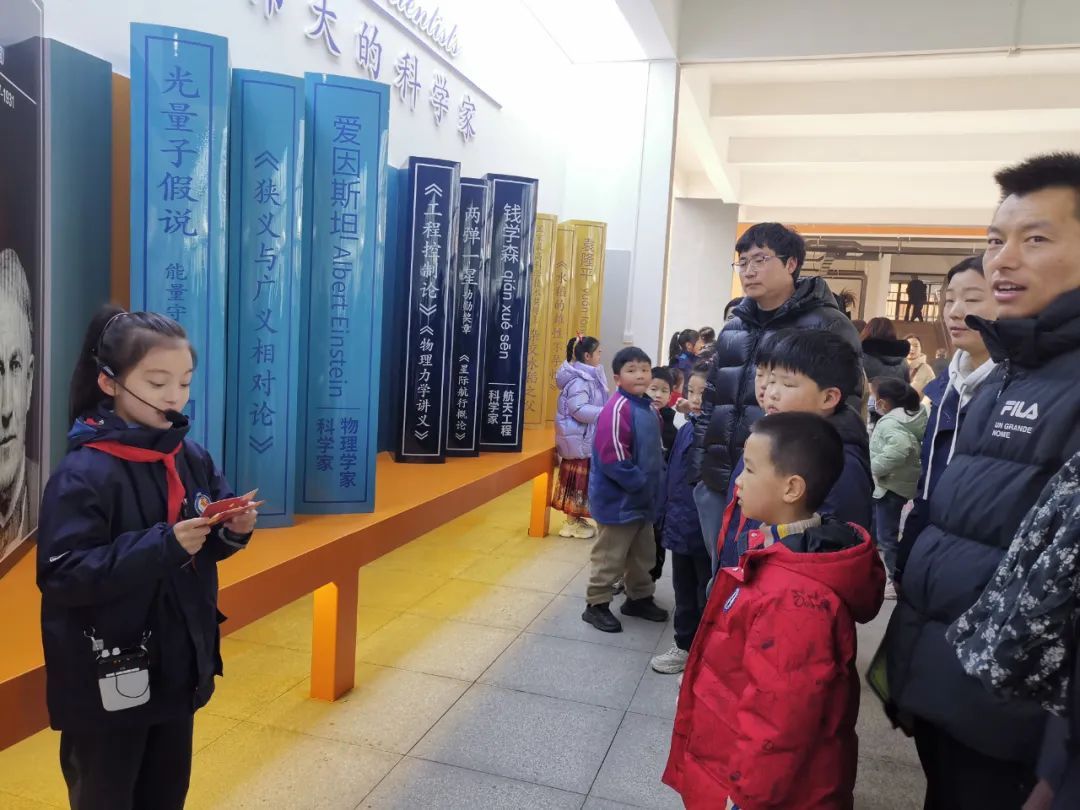 “文化寻根,薪火相传。崇尚科学,追求真理。大家好,我为四小代言,我是杨凌高新第四小学二年级十班管梓涵。在我身后的就是科学家文化墙,这是一个充满智慧和奇迹的地方,看着一本本伟大的科学家书卷,爱因斯坦、牛顿、李时珍、钱学森等科学家们,似乎就站在我们面前,这个长廊就像是一条时光隧道,带领我们穿越历史,去了解那些为人类进步作出巨大贡献的科学家们……”一位小讲解员带领同学、家长们“穿越时空”,重温科学巨匠们的故事。