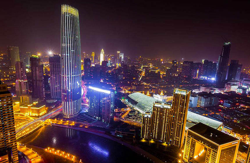 天津环球金融中心,俗称“津塔”,其外形如同船帆,寓意着天津扬帆起航。楼高336.9米,地上共75层,市民可乘坐电梯前往308米的观景大厅,整个津城夜色都能尽收眼底。纵横交错的街道,霓虹闪烁的高楼以及灯火人家,是游客和摄影爱好者不能错过的打卡地之一。(天津市商务局供图)