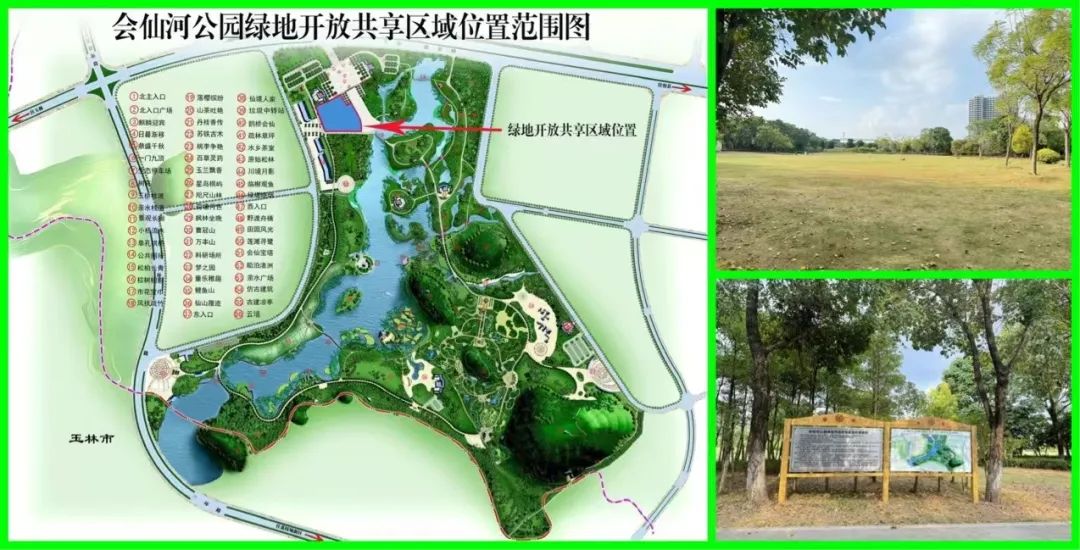北流市会仙河公园总面积约92公顷,共享区域为公园内大草坪,面积约1.8公顷。绿地共享区域计划试点开放时间:每天8:00至22:00(根据草坪生长情况,定期关闭恢复,具体以现场公告为准)。