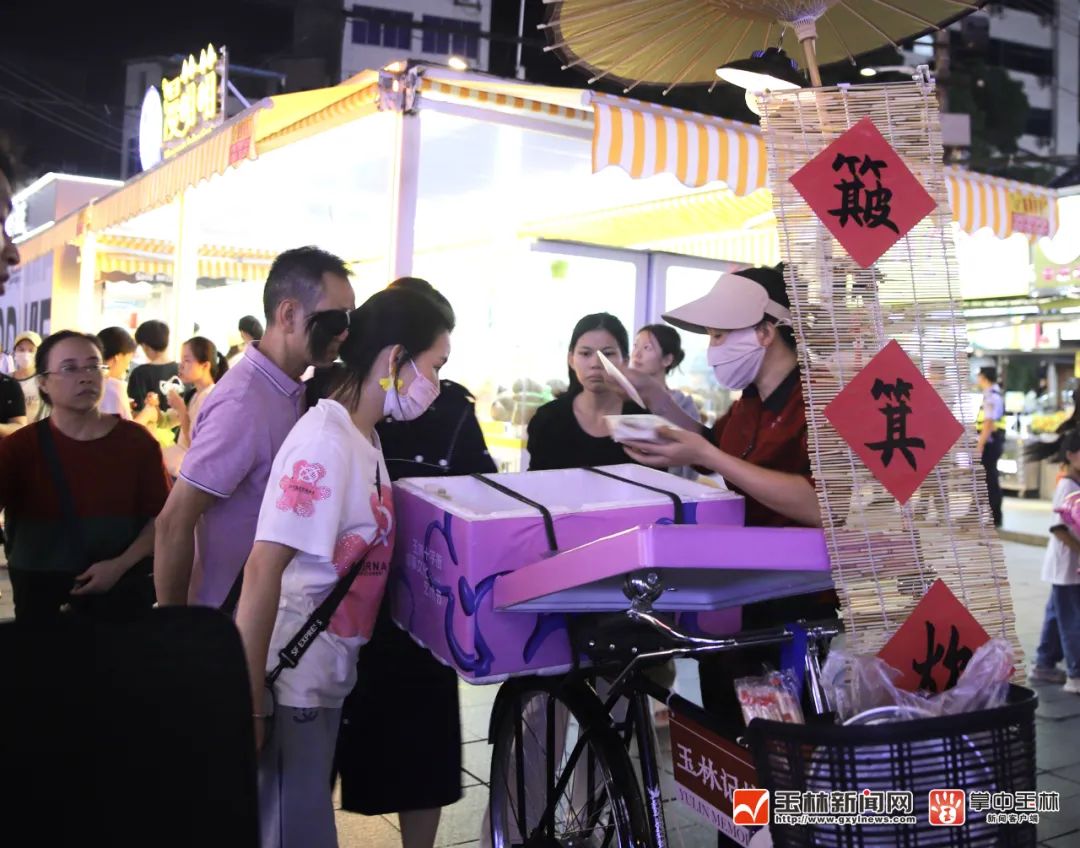 每一辆“28大杠”上都挂着“玉林记忆”的牌子,车尾架上装着一个箱子,箱子里有簸箕炊、双色米蛆、生煎包和各种文创产品等。销售簸箕炊的张老板说,她和丈夫在玉林城区卖簸箕炊已经多年了,得到街坊邻居的帮衬,生意很不错,有的孩子从小吃到大,她受到文化艺术节的邀请前来在十字街销售簸箕炊后,很用心地做了一批簸箕炊,就是想让更多的市民游客品尝到这道博白特色美食。在销售米蛆、生煎包的老式自行车摊位前也围满了顾客,“米蛆和生煎包是很多玉林人童年里难忘的美食,今晚在这里看到它们,我和闺蜜毫不犹豫各买了一份,一边吃一边回忆美好的童年。”自幼在玉林城区长大的何女士说。