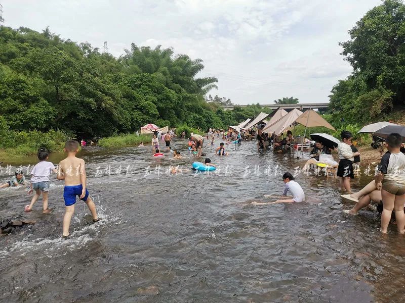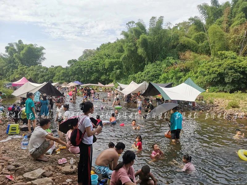 和平村高坡屯旁的沙田河,河水清澈见底,河岸边竹林成荫,竹林下潺潺流水,实为乘凉玩水的好去处。7月14日,不少游客在河岸边架设帐篷纳凉避暑,下河游泳玩水者甚多,现场热闹非凡。一名游客说,他们一家四口从玉东开车过来游玩,这里环境很美,孩子亲水玩水很开心。
