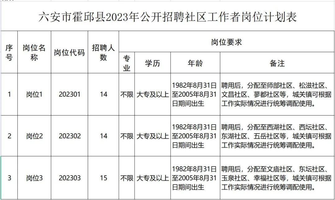 为进一步加强霍邱县社区工作者队伍建设,增强社区治理力量,提升基层治理能力和水平,经研究决定,面向全县公开招聘社区工作者43名。现就有关事项公告如下:一、招聘原则坚持公开、公平、竞争、择优;坚持严把政策,规范操作。二、招聘计划公开招聘社区工作者43名,岗位设置详见《六安市霍邱县2023年公开招聘社区工作者岗位计划表》(附件)。三、报考条件参加公开招聘的人员应具备以下条件:1. 具有中华人民共和国国籍;2. 霍邱县户籍(高、中考录取时为六安市霍邱县户籍或招聘公告发布前户籍已迁入六安市霍邱县)或在霍邱县具有固定住房(以其本人、配偶或父母房产证或经备案的购房合同为准);3. 拥护中华人民共和国宪法,拥护中国共产党领导,政治立场坚定,遵纪守法,品行端正,组织纪律观念强,服从组织安排;4. 具有正常履行职责的身体条件和心理素质;出生年月日在1982年8月31日至2005年8月31日期间;5. 具有国家承认的大学专科及以上学历,报考人员的相关学历学位证书须在2023年8月31日前取得;6. 热爱社区工作,具有一定的组织协调能力及相关业务知识,服从岗位安排,自愿到社区工作3年以上;7. 具备法律法规规定的其他条件。有下列情形之一的人员,不得报名:1.不符合招聘岗位条件要求的人员;2.在读的全日制普通高校生;3.现役军人;4.曾在各类招考中被认定有舞弊等严重违反考试录用纪律行为且在停考期内的人员;5.按照国家、省有关规定,尚在最低服务年限内的机关、事业单位正式在编工作人员,被机关或者参照公务员法管理的机关(单位)辞退未满5年的人员;6.因犯罪受过刑事处罚的人员、被开除中国共产党党籍的人员、被开除公职的人员、被依法列为失信联合惩戒对象的人员;因犯罪被单处罚金,或者犯罪情节轻微,人民检察院依法作出不起诉决定或者人民法院依法免予刑事处罚的人员;受到诫勉、组织处理或者党纪政务处分等影响期未满或者期满影响使用的人员;涉嫌违法违纪、正在接受审查尚未作出结论的人员;7.煽动、组织群众非正常上访,参加邪教组织、非法宗 教活动和封建迷信活动的人员;8.法律法规规定不得报考的其他情形的。四、招聘程序招聘按照网上报名、笔试、资格复审、面试、成绩合成、体检、考察和公示、聘用等程序进行。主要程序如下:(一)网上报名1. 报名采用网上报名的方式进行。报考人员登录网上报名服务平台()报名。统一报名时间为2023年9月11日8:00至9月14日16:00,逾期不再报名。每位报考人员限报一个岗位,并须使用本人同一有效居民身份证进行报名和参加考试。报考人员需认真阅读报名须知,填写《六安市霍邱县2023年社区工作者招聘资格审查表》,上传本人电子照片(近期免冠正面证件照,jpg格式,尺寸为295×413像素,大小20-100kb)。2. 资格审查贯穿公开招聘全过程。报考人员所填信息必须真实无误,考生填写的信息必须与本人实际情况、报考条件和所报考的岗位要求相一致。凡弄虚作假或虽通过资格审查但实际与招聘条件规定不符的,一经查实,取消考试、录聘等资格。3. 报考人员报名后至2023年9月15日16:00前可登录网上报名服务平台()查询是否通过资格审查。通过审查的,不得改报其他岗位;未通过审查的,在2023年9月16日12:00前可以改报其他岗位。初审合格人员于2023年9月16日16:00前登录网上报名服务平台()缴纳考试费用,参照事业单位录用人员考试收费标准,按每人45元的标准缴纳笔试费用,逾期未缴费的视为自行放弃。4. 确认报考人数与岗位招聘计划数的比例达不到3:1的,经县社区工作者公开招聘领导小组研究,取消或核减该岗位招聘计划数,取消或核减招聘岗位计划数在霍邱先锋网公示。被取消招聘岗位的报考人员,可于2023年9月18日16:00前改报其他符合要求的岗位。(二)笔试1. 笔试科目和内容。笔试科目为《综合知识》,采取闭卷形式,满分100分。笔试内容侧重于基层工作实际,主要内容为党和国家在基层的方针政策、群众工作能力、基层党建工作、社区工作实务等有关知识和省、市、县情等(不指定教材)。2. 笔试的时间和地点。笔试时间在霍邱先锋网公布,请考生持续关注霍邱先锋网,登录网上报名服务平台()打印准考证。笔试时间、地点详见笔试准考证。考生持笔试准考证、有效居民身份证到指定的考场参加考试,不按规定时间、地点参加笔试的,视为自动放弃资格。3. 笔试成绩。笔试成绩在霍邱先锋网公布。笔试成绩低于60分的,取消进入下一环节资格。(三)资格复审1. 根据考生笔试成绩从高到低顺序和岗位招聘计划数,按照2:1比例确定入围资格复审人员名单。最后一名如有数名考生笔试成绩相同的,一并确定为入围资格复审人员。资格复审人员名单、时间和地点等在霍邱先锋网另行公示。2. 由县社区工作者公开招聘领导小组成员单位负责资格复审工作。资格复审依据招聘公告规定的报考资格条件,逐一审核考生报名时填写的信息与考生提供的证件材料。参加资格复审的考生应携带从网上报名服务平台()下载的《六安市霍邱县2023年社区工作者招聘资格审查表》、笔试准考证、本人有效居民身份证、教育部学籍在线验证报告(学信网打印)、学历证书、户口簿首页和本人页(非霍邱县户籍报考的考生,须携带本人、配偶和父母在霍邱县的房产证或经备案的购房合同)等材料原件及复印件,近期两寸正面免冠同
