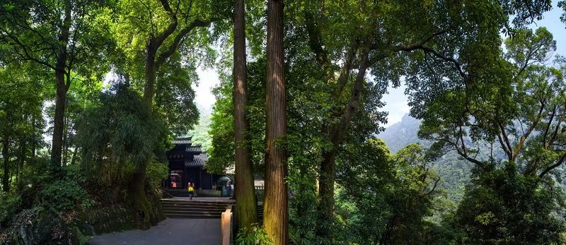 寺院周围山抱林拥,葱郁幽静,雨雾蒙蒙,千枝滴翠。晨曦抚照在林丛之上,雾化为露,瀼瀼泠泠,如粒粒晶莹的无数珍珠,积满了草丛和林梢,只听见密密的林丛中沙沙作响,似觉细雨沛然。顷刻间,浓雾弥漫,只闻人语,不见人影,咫尺竟成了天涯。如绡的晨雾,湿泣泣的带着山野里特有的清香迎面年来,使你感到格外清爽可人。这里的气漫无边际较为稳定,冬无严寒,夏无酷暑,有着四季常春之感。深谷里常常传来阵阵林涛,碧空中隐隐回旋着声声鸟语。确是个休闲颐养的好地方。此地上行仙峰寺15公里,有磴道七千多级;下行清音阁6公里,有噔道三千多级。如果说鉴胜峨眉是一篇完美的诗章,这里自然是承转的段落。要欣赏这""晓雨""之妙,以夜宿寺中为宜。从夕阳西斜到黎明拂晓,还有许多景色可观。这里有许多银杏古树,一至清秋,扇叶金黄,与满山红叶相互掩映,色彩绚丽柔美,故诗人在诗中吟道“不尽霜枫万里黄”。