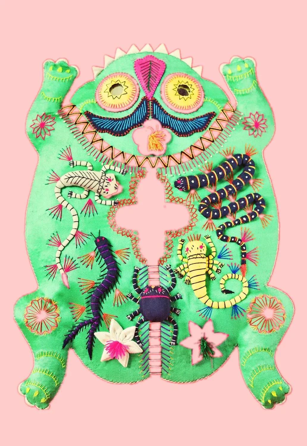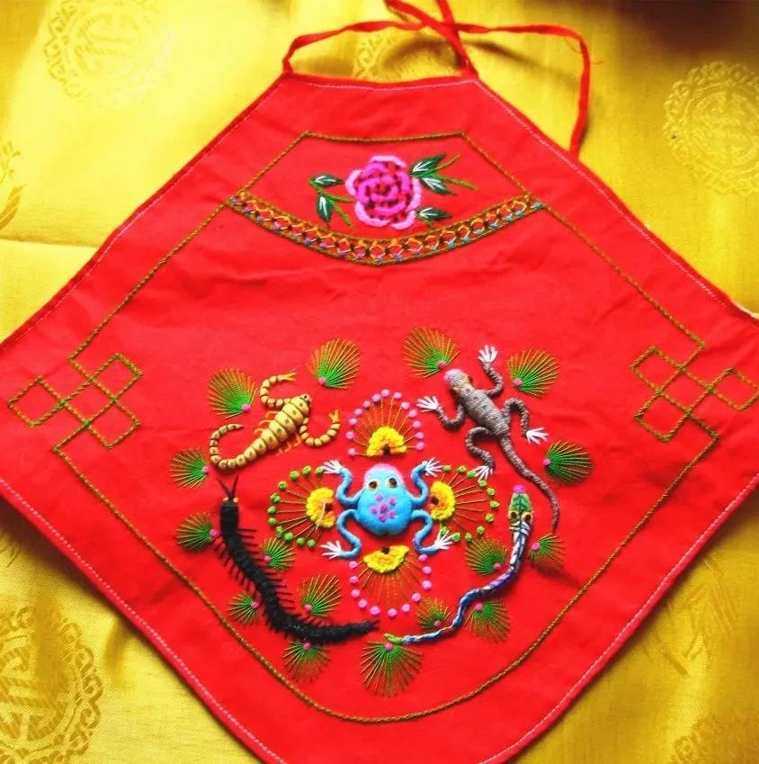 刺绣耳枕用“五毒”装扮,意为辟邪保平安。