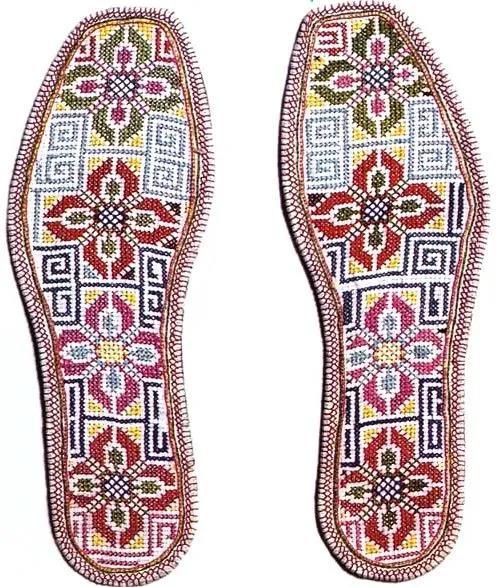 陪嫁的绣花鞋垫有十字绣、扎针绣,针工密实。姑娘出嫁前分别给新郎的家人每人绣制一双,寓意全家步调一致、和顺康乐。
