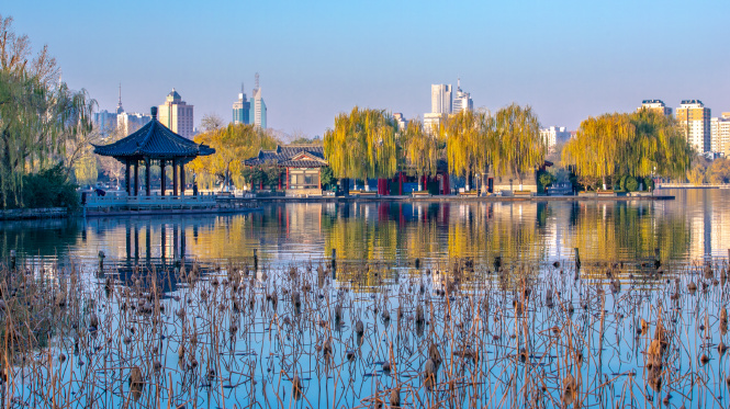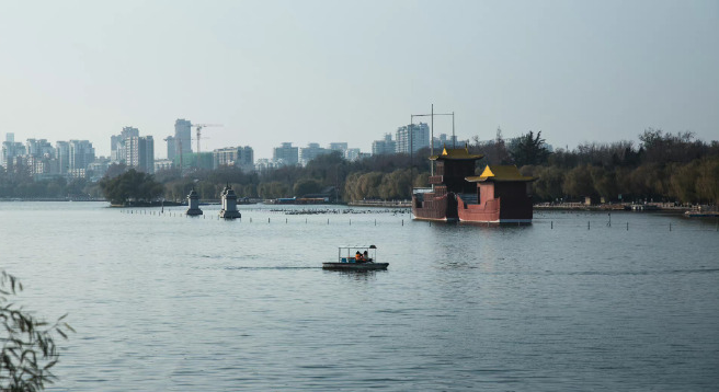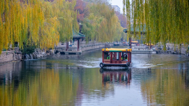 冬日的大明湖显得更加清澈而静谧,湖水微漾、倒影连绵,一眼望去好似走进了连绵不断的水墨画卷。除了步行漫游,于波光粼粼的大明湖上荡浆泛舟也是不错的选择。“水上看山山更多,明湖舟似镜中过”这一景观便是“明湖泛舟”。
