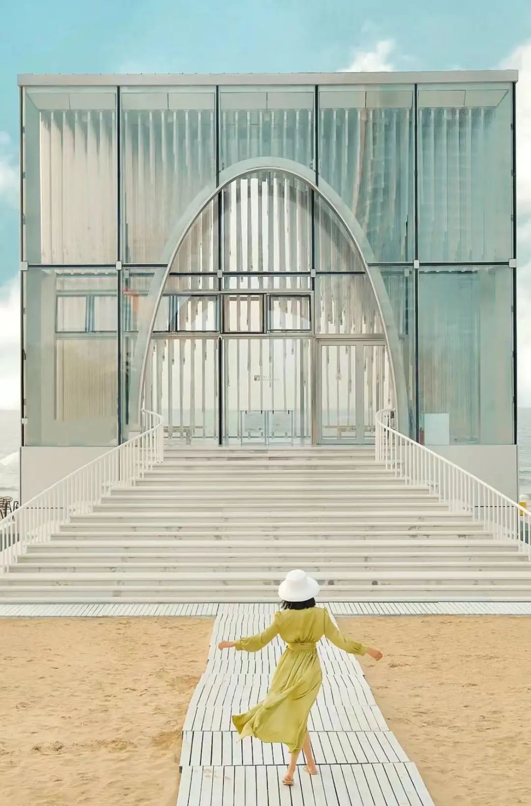 海天之间,金属线条结构的教堂,被玻璃包裹的墙壁透着远处的大海,仿佛伫立在世界的尽头,说它是烟台版的阿那亚,也一点都不为过。