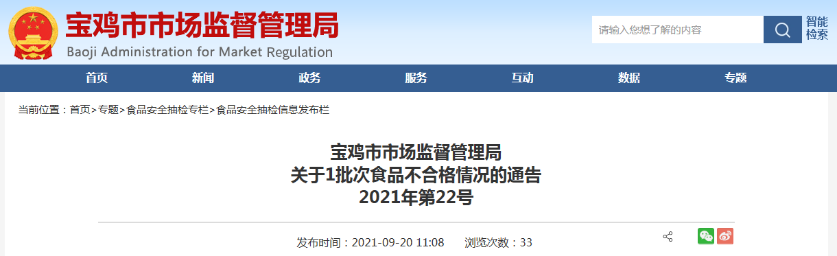 中国质量新闻网讯 近日,陕西宝鸡市市场监督管理局发布关于1批次食品不合格情况的通告(2021年第22号)。通告称,近期,该局组织抽检糕点一大类食品50批次,合格49批次,不合格1批次。不合格产品情况如下: