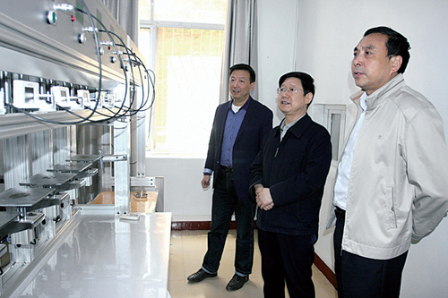 陕西省质监局局长乔军(右一)深入汉中市勉县锦泰实业有限公司调研。汉中市政府副市长何俊杰(左二)、汉中市质监局局长孟晓东(左三)一同调研。