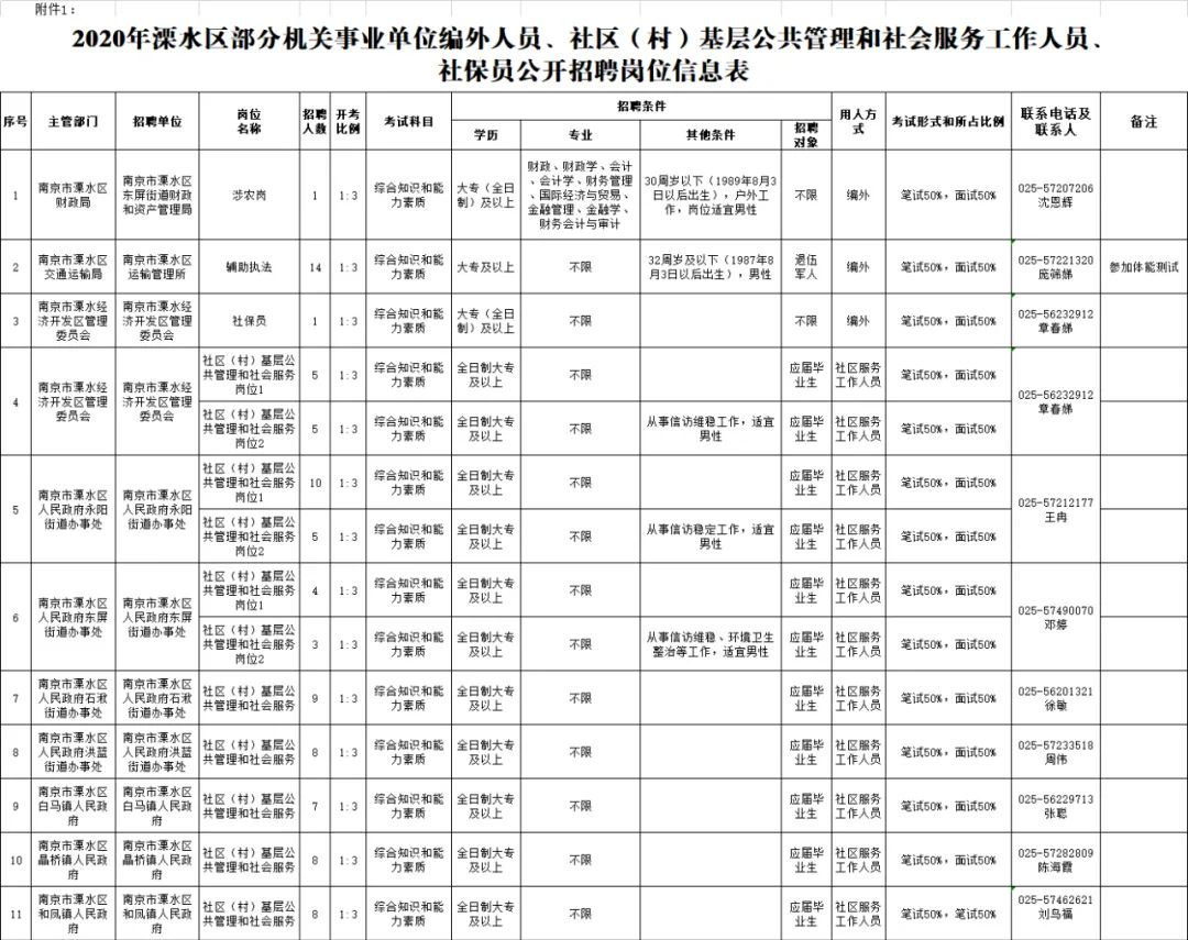为更好地选拔优秀适岗人才,优化编外人员结构;推动社区治理创新,适应新时期社区建设需要,打造一支高素质的社区(村)工作者队伍。溧水区部分机关事业单位面向社会公开招聘15名编外人员;开发区、各镇(街)公开招聘72名社区(村)基层公共管理和社会服务工作人员、1名社保员。