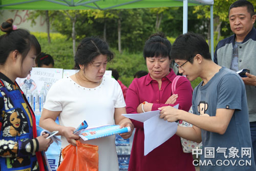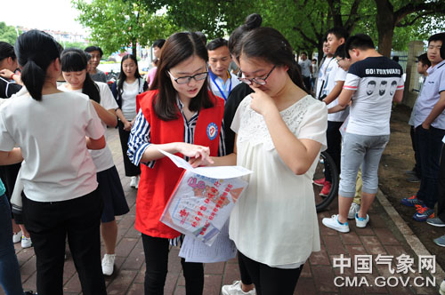 气象人员正在向考生发放高考专题服务材料。