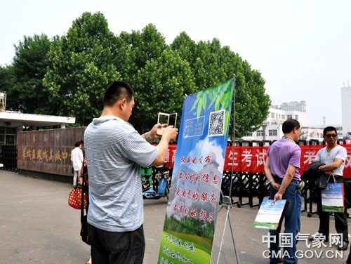 一位考生家长在考点添加“莱芜气象”微信公众号。