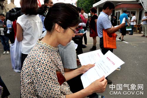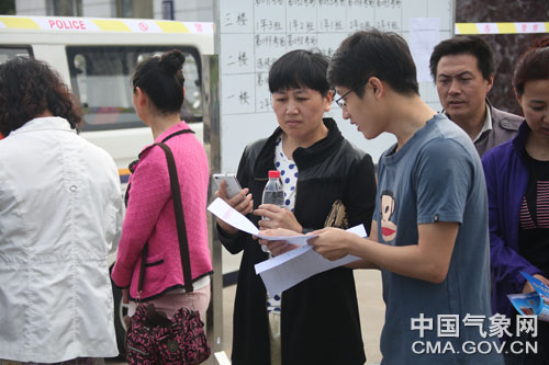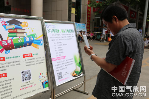 考生家长在认真看高考天气预报材料。