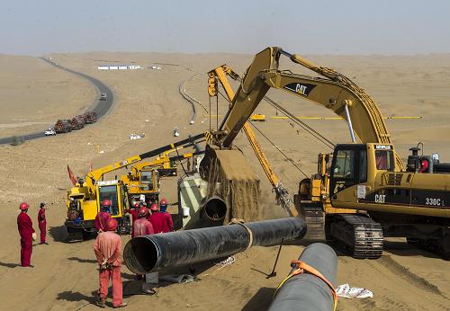中石油塔里木油田工人在塔克拉玛干沙漠中铺设油气管道(2013年7月27日摄)。新华社记者 王菲 摄