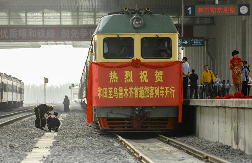 首列往返于乌鲁木齐与和田两地之间的5826/7次列车在等待发车(2011年6月28日摄)。新华社记者 江文耀 摄