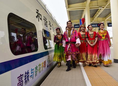 身穿民族服饰的当地居民在吐鲁番北站迎接首批乘坐“高铁杏花专列”抵达前来旅游的游客(2015年3月21日摄)。新华社记者 赵戈 摄