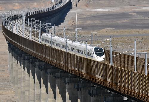 动车行驶在哈密地区的一座大桥上(2015年5月22日摄)。新华社记者 吴丹妮 摄