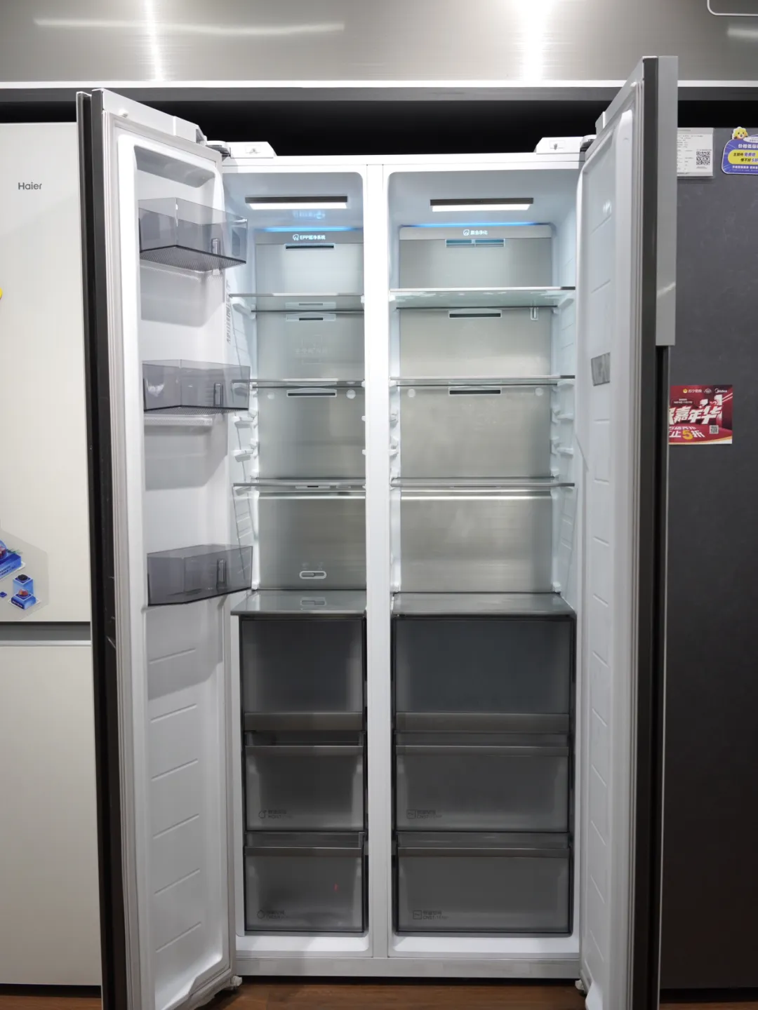 海尔这款对开门冰箱,样式简简单单很好看。冷藏室 265 升、冷冻室 205 升的容量日常用也足够,抽屉很多,方便分类储存。