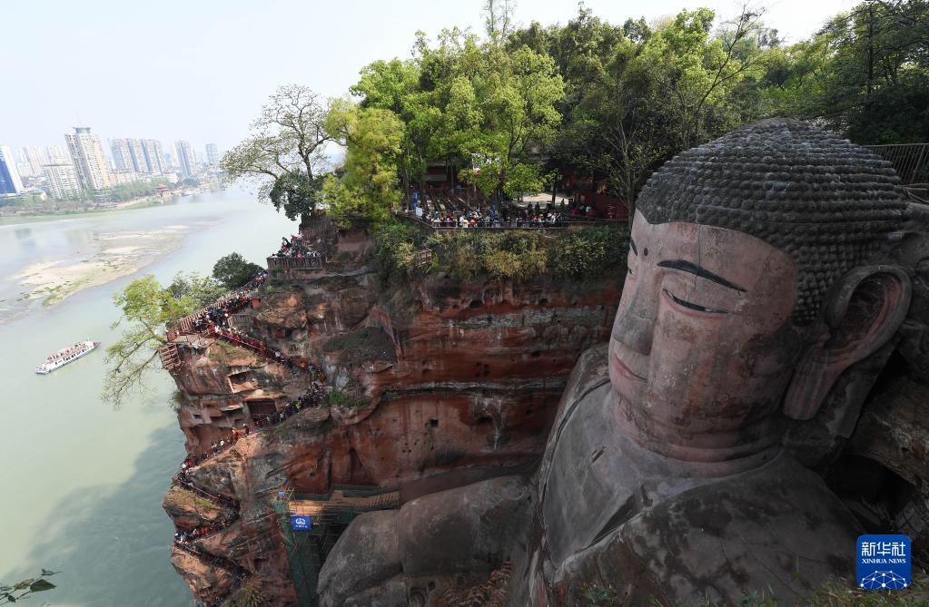 游客在乐山大佛景区游览(2019年4月1日摄)。