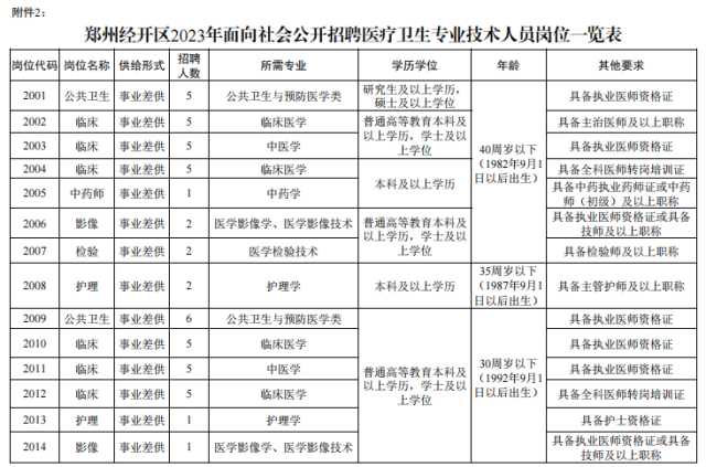 2.医疗卫生专业技术人员50名,各岗位招聘资格条件、计划人数详见《郑州经开区2023年面向社会公开招聘医疗卫生专业技术人员岗位一览表》(附件2)