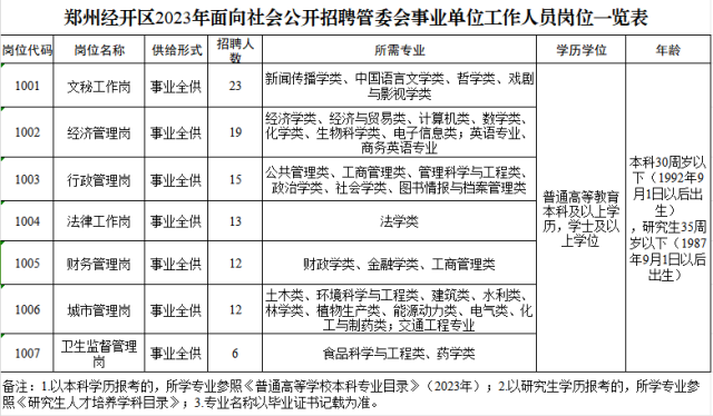 1.管委会事业单位工作人员100名,各岗位招聘资格条件、计划人数详见《郑州经开区2023年面向社会公开招聘管委会事业单位工作人员岗位一览表》(附件1)