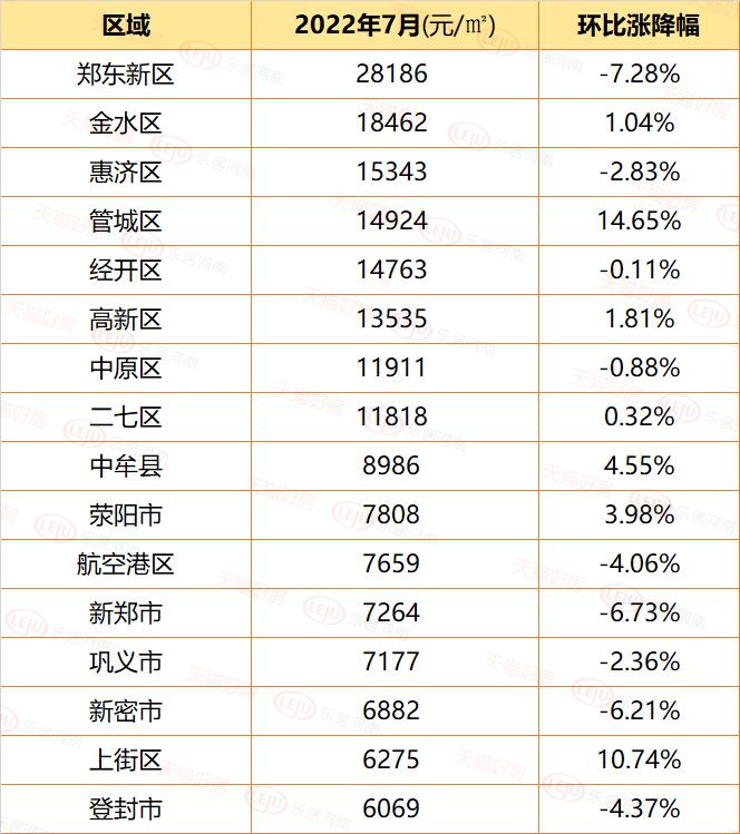 乐居买房讯 郑州最新房价地图出炉!据克而瑞河南数据显示,2022年7月大郑州16区房价7涨9跌,其中,主城商品住宅成交均价17733元/㎡,环比下跌9.8%,同比上涨13.6%;环郑商品住宅成交均价7606元/㎡,环比下跌2.1%,同比下跌5.5%,环郑区域持续下探。