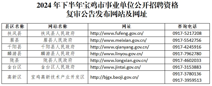 (二)资格复审。面试资格复审由各报考县区组织实施,时间地点等相关信息在各县区人民政府网站公告(网址见下表)。