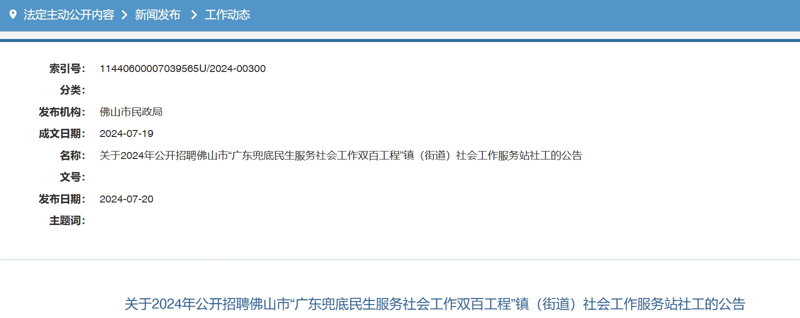 根据《广东省民政厅 广东省教育厅 广东省人力资源和社会保障厅关于做好2024年公开招聘“广东兜底民生服务社会工作双百工程”乡镇(街道)社会工作服务站社工工作的通知》(粤民函〔2024〕212号)精神,决定组织开展2024年公开招聘佛山市“广东兜底民生服务社会工作双百工程”(以下简称“双百工程”)镇(街道)社会工作服务站社工工作。现将有关事项公告如下: