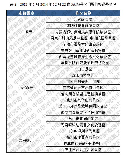 前言 景区是传统旅游产业的三大支柱之一。近年来,我国旅游景区数量持续增加,规模不断扩大,游客数量连年攀升,有关景区门票价格过高且频繁涨价等问题已争论多年。几乎每到旅游旺季,景区门票价格就会成为媒体和公众关注的焦点话题,尤其是5A级景区门票价格及其变动更是倍受关注。 为着力推动解决部分景区门票上涨过快、过高和园中园、票中票等不合理、不规范现象,国家旅游局宣布自2015年3月起按照国务院要求,会同有关部门和地方积极推进景区门票价格改革,规范景区门票价格行为,其中一项重要举措就是在全国景区系统组织开展“旅游价格信得过景区”创建活动。 在此背景下,中国社会科学院旅游研究中心继完成《2013年中国4A、5A级旅游景区门票价格分析报告》两年之后,重点围绕5A级景区,对原有数据和分析进行更新,并搜集国外部分知名景区数据,完成《我国5A级景区门票价格分析与国际比较(2015)》专题报告,以期为政府决策、景区运行、社会认知提供科学依据。 自2007年5月全国旅游景区质量等级评定委员会批准北京市故宫博物院等66家景区为全国首批5A景区之后,我国5A级景区的数量逐年稳步增长,2012年达到145家,2013年达到175家。截至2014年底,我国共有5A级景区186家。2012~2014年同比增长率分别为20.83%、20.69%和6.29%。从省区分布来看,江苏数量最多,为19家;其次为浙江,共11家;再次为河南、湖北和广东,均为10家;青海、西藏和天津的数量最少,均只有2家。 通过全面搜集、统计、分析我国5A级景区门票价格数据,我们发现如下重要事实。