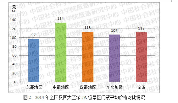 统计各年度所有5A景区门票平均价格发现,2012~2014年分别为109元、110元和112元,基本保持稳定。所有5A景区、新增5A景区、原有5A景区的平均价格见图1。