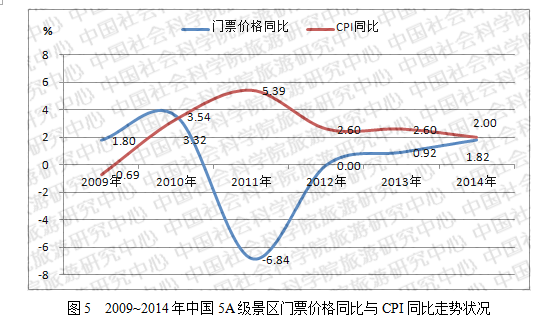将2009~2014年全国5A级景区门票平均价格同比增幅与CPI同比增幅进行比较发现,前者先降后升,后者先升后降,二者呈反向态势(见图5)。2012年成为5A级景区门票平均价格增势的分水岭,其主要原因在于,2012年我国5A级景区数量增幅较大,从而拉低了整体平均价格。