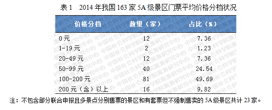 在所有5A级景区中,门票价格在100-200元之间的居多(共有81家,占49.69%),其次为50-99元之间(共40家,占24.54%),门票价格在20-49元之间和在200元以上的分别为12家和16家,各占7.36%和9.82%,价格在1-19元之间的有2家,占1.23%,另有12家5A景区实行免票政策(见表1)。