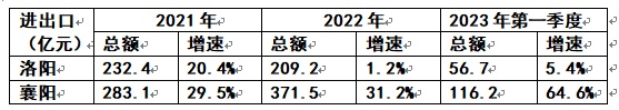 如果和襄阳相比,可谓是“冰火两重天”:2021年襄阳进出口总量比洛阳多出50.7亿元,增速高出洛阳9.1个百分点。到了2022年总量超出洛阳162.3亿元,增速比洛阳高出30个百分点。到了今年的第一季度,仅仅三个月,总量就比洛阳多了59.5亿元,增速高出洛阳59.2个百分点。用“一路高歌”形容一点都不过分。