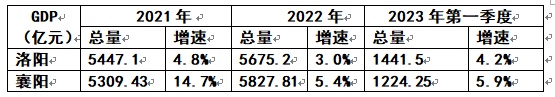 可看出:2021年襄阳GDP的增速是洛阳的3.06倍;2022年是洛阳的1.8倍;今年第一季度,尽管洛阳的总量超过襄阳217.25亿元,但是在增速上仍然低于襄阳1.7个百分点。这说明:洛阳要想把襄阳甩下去,必须在增速上下功夫。