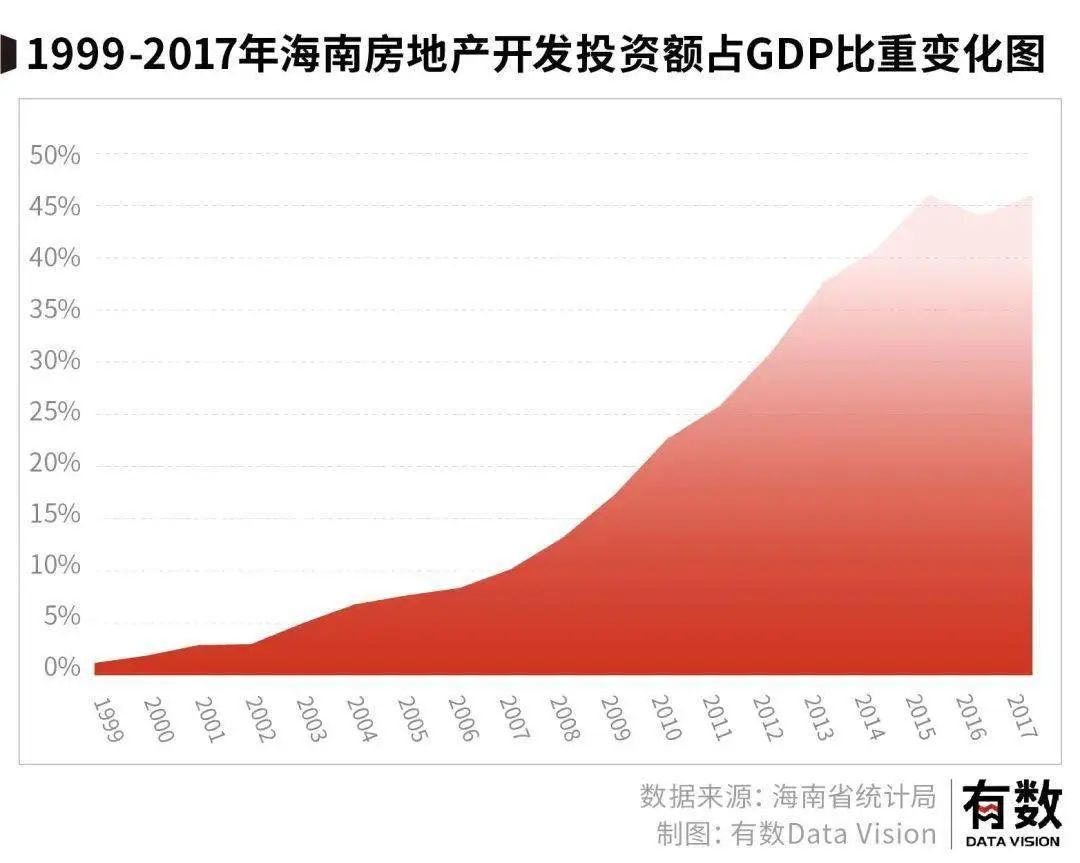 进入新千年后,海南房地产开发的金额在GDP中的比重逐年增加,在2010年宣布海南建设国际旅游岛之后,这一比例从没低于20%,在顶峰的2017年甚至达到46%,是全国平均水平的3倍还多。