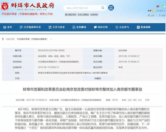 公开报道显示,今年6月,安徽省蚌埠市官方披露,蚌埠市发改委一行赴江苏省南京市发改委对接蚌埠市整体加入南京都市圈有关事项。