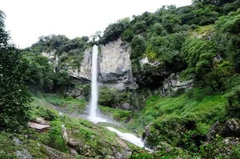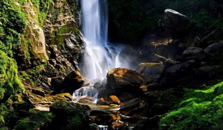 滮水岩瀑布被喻为一帘垂挂在蓝天上的“白色哈达”。虽不及“飞流直下三千尺,疑是银河落九天”的夸张,但它的壮美,令人心驰神往!标水岩瀑布自上而下全长256米,倾角75度,上帘宽3米,下帘宽35米,丰水期下帘宽可达40多米。从很远的地方就可以清晰地看到:在绿色的丛林中,一条银白色的哈达悬天而逸。走近她,如珠帘垂壁;斜里侧观,似白练当空舞;向下俯视,像飞龙入水;抬头仰望,犹仙女散花,四季清脆的水流从瀑顶的原始森林中突然奔出,訇然而下。那不顾一切腾跃的执着,卷起的雾露弥漫在空中。有阳光的日子,天上的彩虹就降临,民间叫“下来喝水”。无论我们从哪个角度看,都是一道不同的风景,都是一种不同的享受,让人不禁扼腕惊叹,留连忘返。山和水的完美结合,静和动的和谐搭配,组成了这里最美最靓丽的风景。