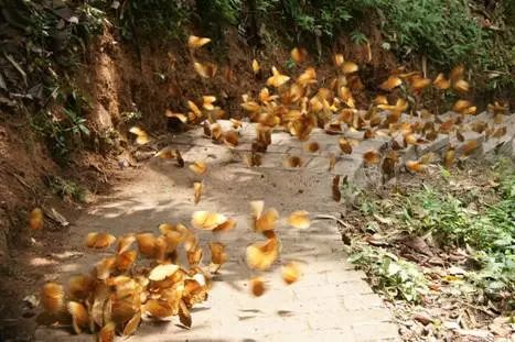 每年春末初夏,正当满山遍野的中华大节竹新笋哔啵抽条,展枝亮叶的时候,白袖箭环蝶就开始大量爆发,数量多达上亿只。这支集聚的大部队,在一夜之间就占领了马鞍底的各个山头,片片竹林。她们在林间、在绿韵中或舞蹈、或觅食、或产籽,构成了“天女散花,落英缤纷”的神奇景观。