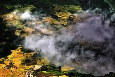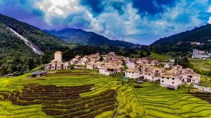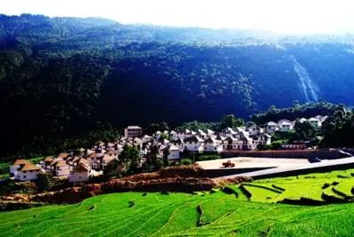 与滮水岩瀑布仅仅一步之遥的风景,就是滮水岩村。滮水岩的太阳比鸟儿起的还早。勤劳的太阳用嫩绿色,从五台山顶一坡的涂下来。一不小心,就碰到了山腰林中的寨子和满寨子的亲戚朋友。进了寨子的阳光,在蘑菇房上与袅袅的炊烟亲切交谈。动情处,炊烟好像乱了方寸,上升的步子更加婀娜。生长在汪汪水田边的那朵朵蘑菇房的墙壁,被阳光悄悄的涂成了嫩黄色。柴栅“咕”地开了,一群白羽鸭子昂首扇翅,嘎嘎的夺出门,扑入田水中。一个穿着藏青色服饰,头戴三角黑帕的少妇,左手掖了一只筲箕,筲箕中盛了嫩绿的苤菜,右手持了一根小竹竿亮出门来。阳光在她的脸上闪动出一个笑靥……一个背着大书包的少年,迎着太阳出门。手里摊着一坨用绿色芭蕉叶包着的黄色糯米饭团,掰了一小坨放进嘴巴,嚼着,朝了村头飘着的五星红旗而去……