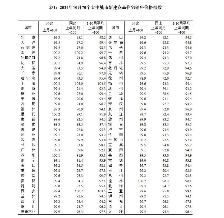 表1:2024年10月70个大中城市新建商品住宅销售价格指数