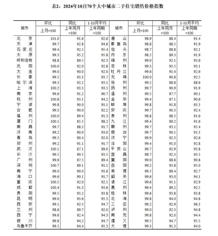 表2:2024年10月70个大中城市二手住宅销售价格指数