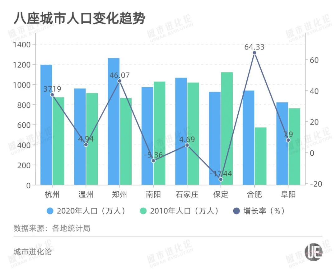 在安徽,合肥十年人口增长率高达64.3%,从2010年570.20万一路增长到2020年936.99万;此前人口排名全省第一的阜阳虽然也实现小幅增长,但面对合肥的强劲势头,无奈退居第二。