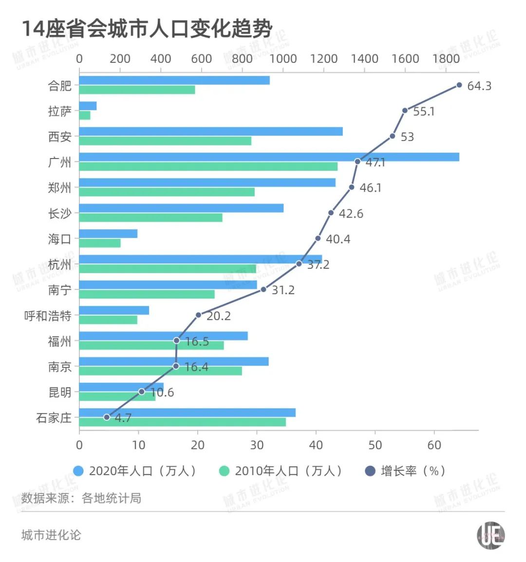 在14个省份中,所有省会都在人口增长同时实现人口首位度提升。但从各个省份人口增长情况来看,除内蒙古人口负增长外,河北、湖南、安徽、云南人口增速也低于全国5.4%的平均水平。