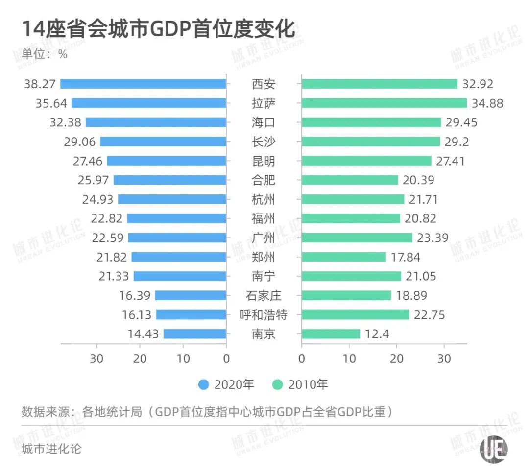 而与十年前相比,有四个省会在反超省内其他城市后实现登顶: